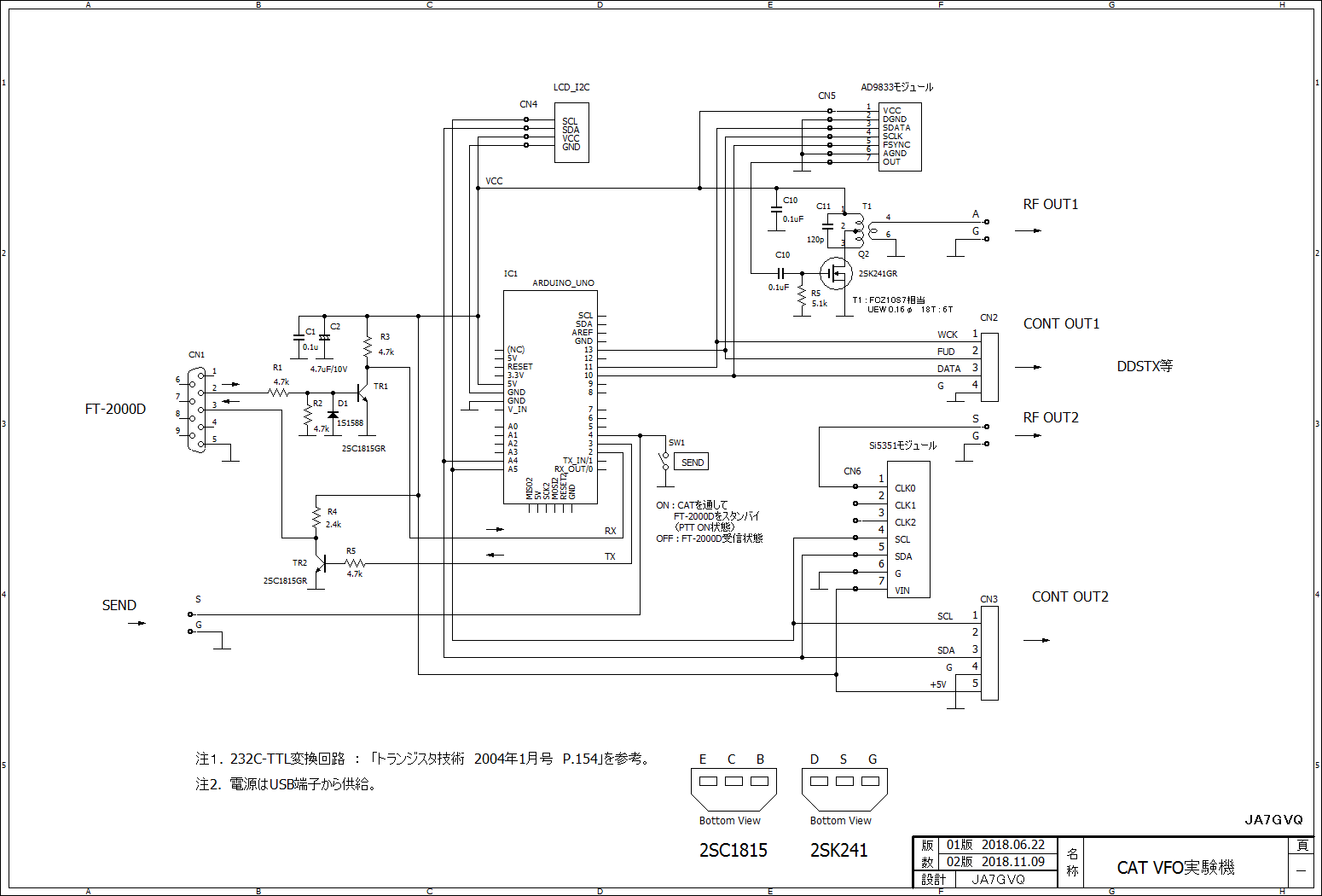 今回は、実験用としてジェネレータ部へAD9833(実験1)とSi5351(実験2)を実装し、アナログインタフェースにより自作送信機QT-71Jと接続しました。